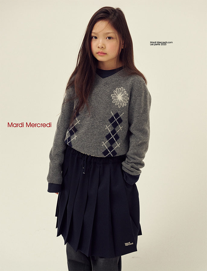 KIDS CASHMERE BLENDED V NECK ARGYLE_GREY CREAM
